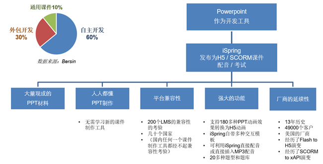 财富500强企业大多数的课件都自主开发,主要的开发工具为PPT to H5的快速课件开发工具,譬如:iSpring等